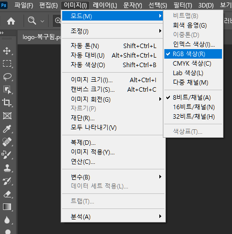- 포토샵 상단의 메뉴 바에서 이미지를 클릭. 작업할 이미지는 이미 열려 있어야 됨.