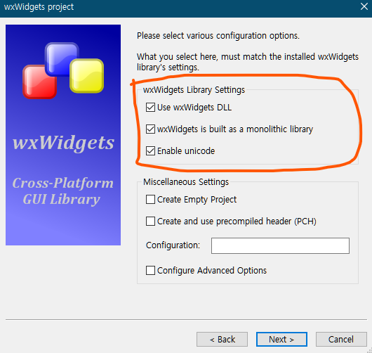 wxWidgets에 대한 옵션들을 설정.