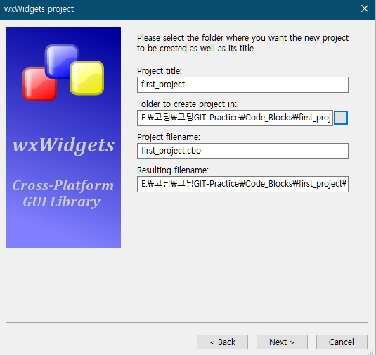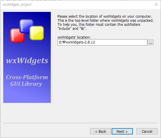 좀 전에 컴파일했던 wxWidgets 라이브러리의 경로를 설정.