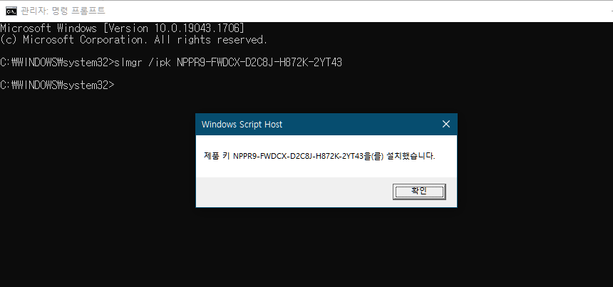 5. slmgr/ipk 를 입력하시고 그 뒤에 제품키를 입력하시면 됩니다.