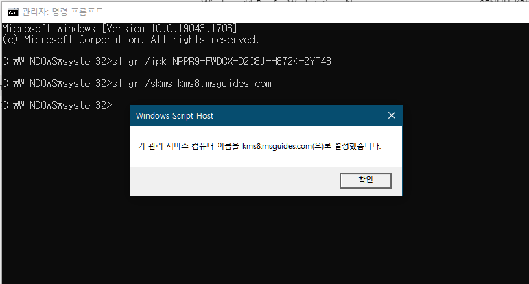 6. slmgr /skms kms8.msguides.com 입력하시면 됩니다.