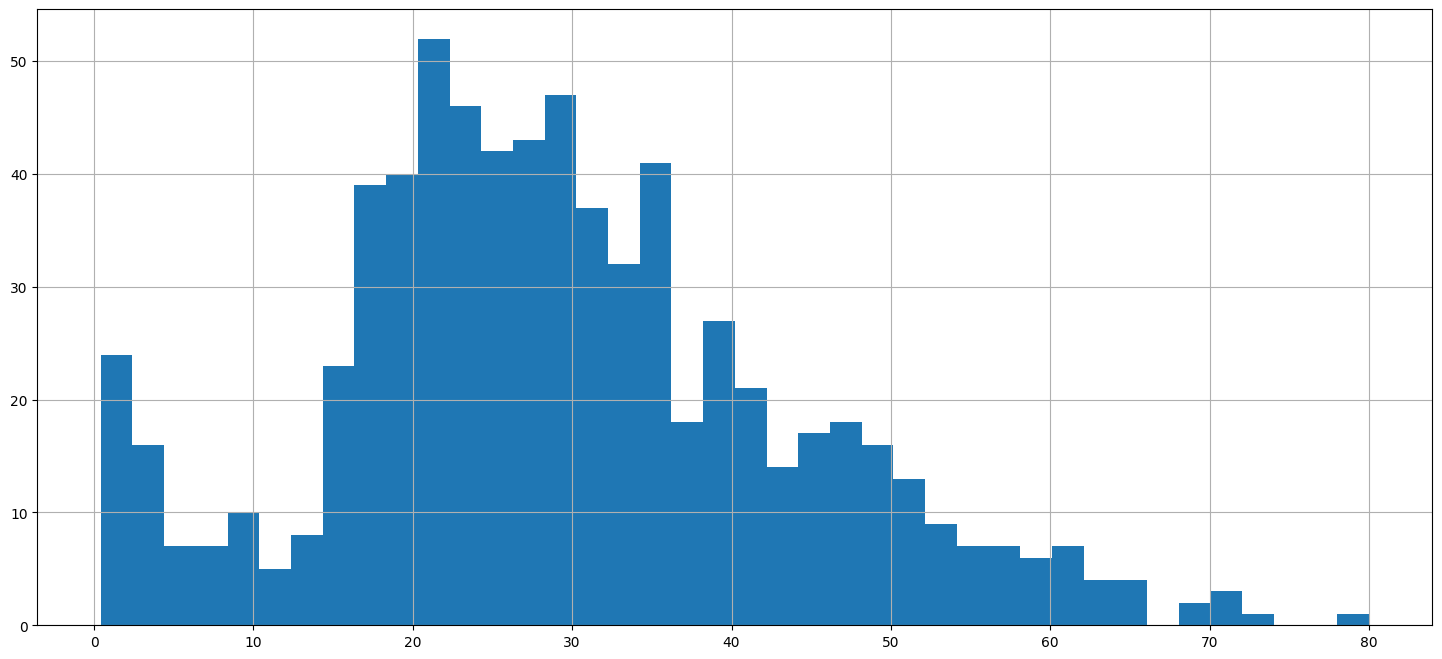titanic['Age'].hist(bins=40,figsize=(18,8),grid=True)